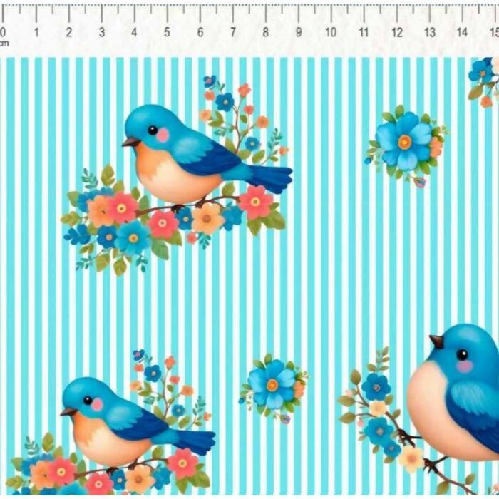 Descrição Tecido Tricoline Digital Blue Birds Pássaro Listrado