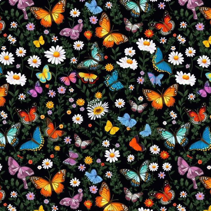 Descrição Tecido Tricoline Digital Borboletas e Margaridas Fundo Preto
