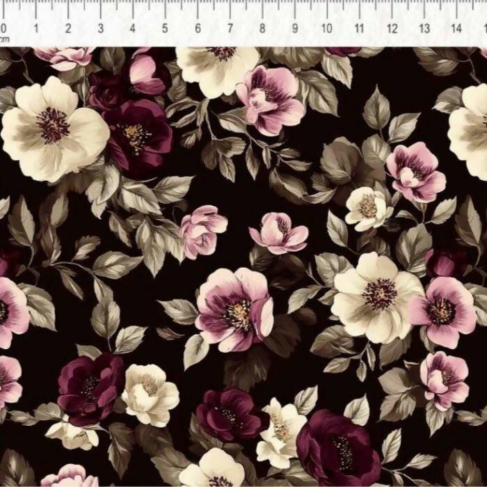 Descrição Tecido Tricoline Digital Bordeaux Floral 2