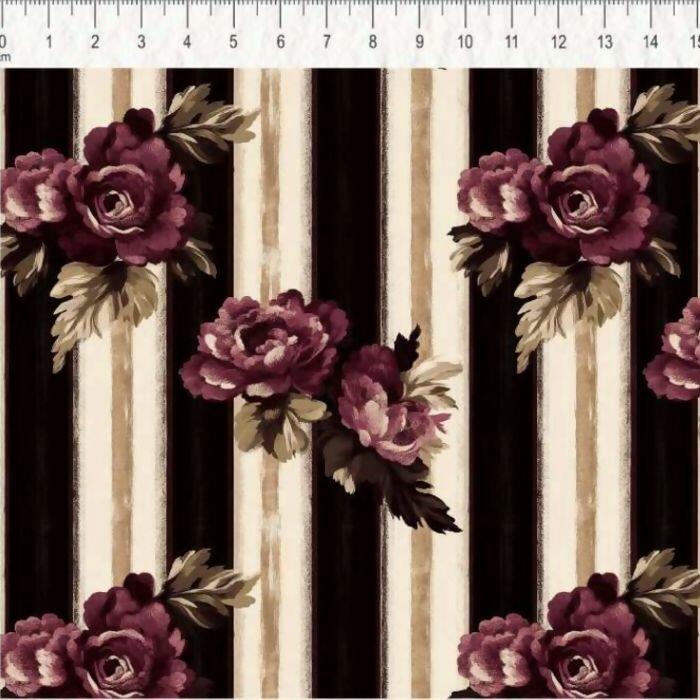Tecido Tricoline Digital Bordeaux Floral Listrado