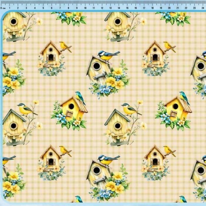 Descrição Tecido Tricoline Digital Casinhas Amarelas Fundo Xadrez