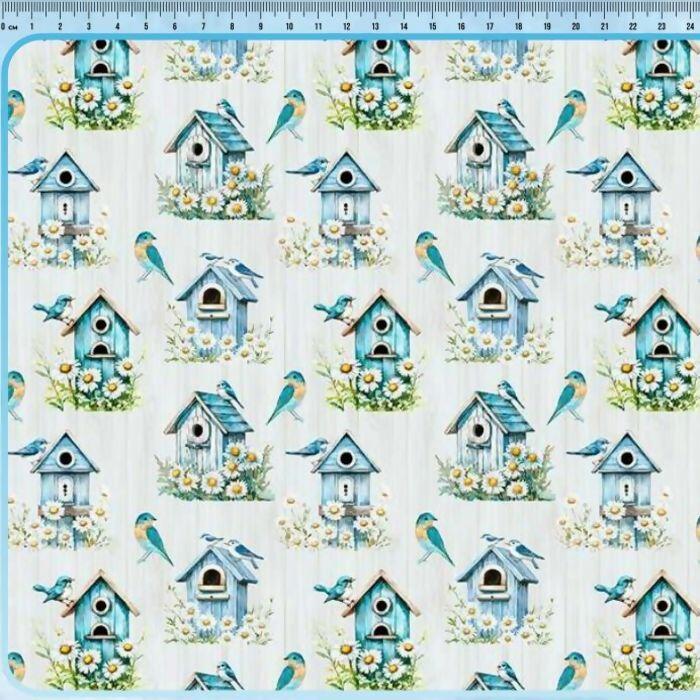 Tecido Tricoline Digital Casinhas Azuis e Pássaros