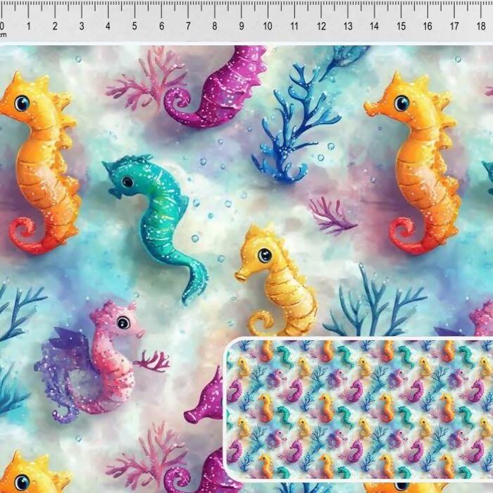 Tecido Tricoline Digital Cavalo Marinho Oceano