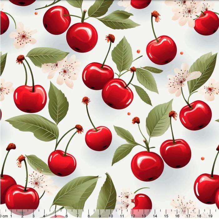 Descrição Tecido Tricoline Digital Cereja e Flores Fundo Branco