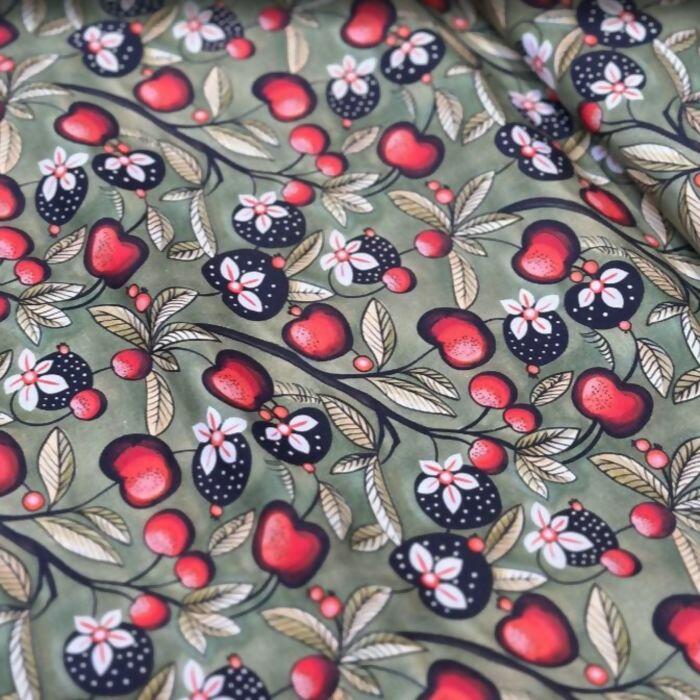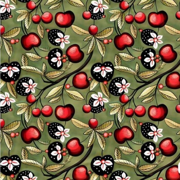 Tecido Tricoline Digital Cereja Fundo Verde