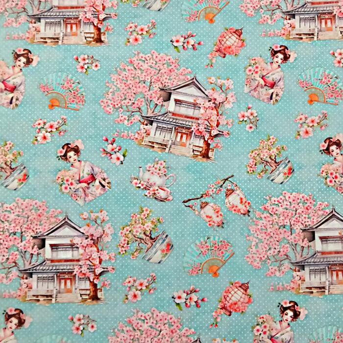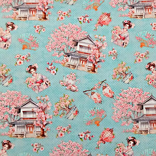 Descrição Tecido Tricoline Digital Cerejeiras Fundo Poá