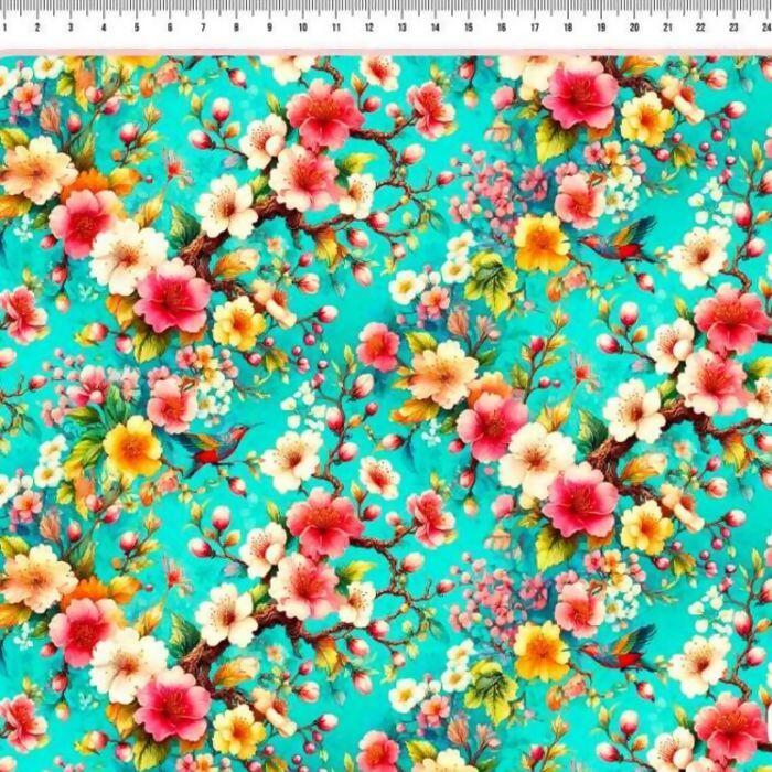 Descrição Tecido Tricoline Digital Cerejeiras Fundo Verde Claro