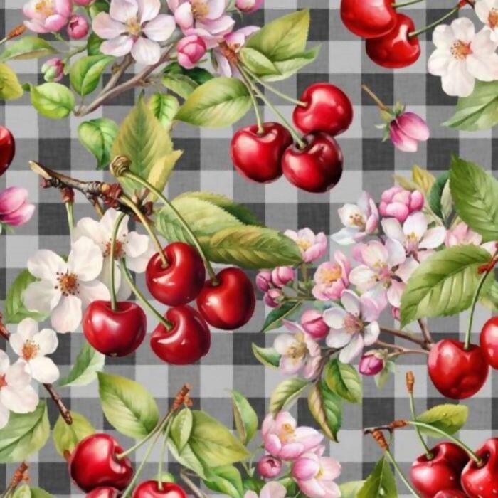 Descrição Tecido Tricoline Digital Cerejinhas Fundo Xadrez