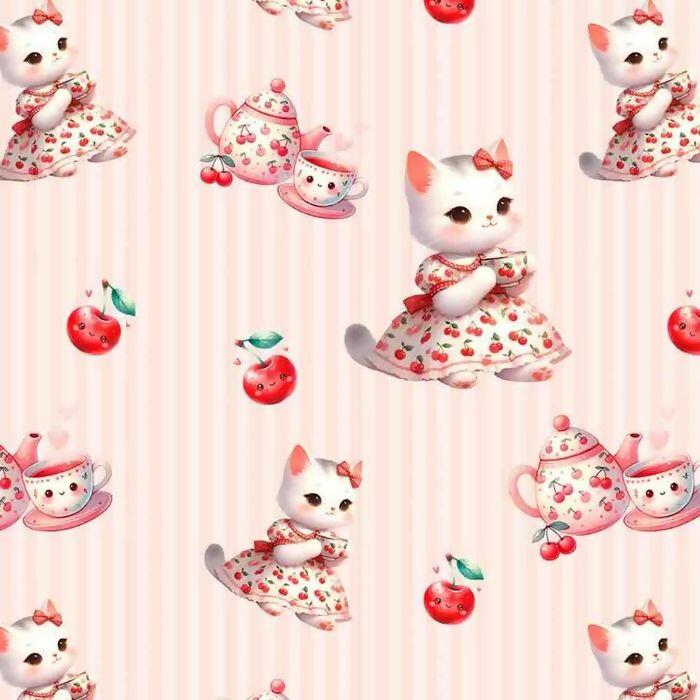 Descrição Tecido Tricoline Digital Cherry Kitties Gatas e Bules