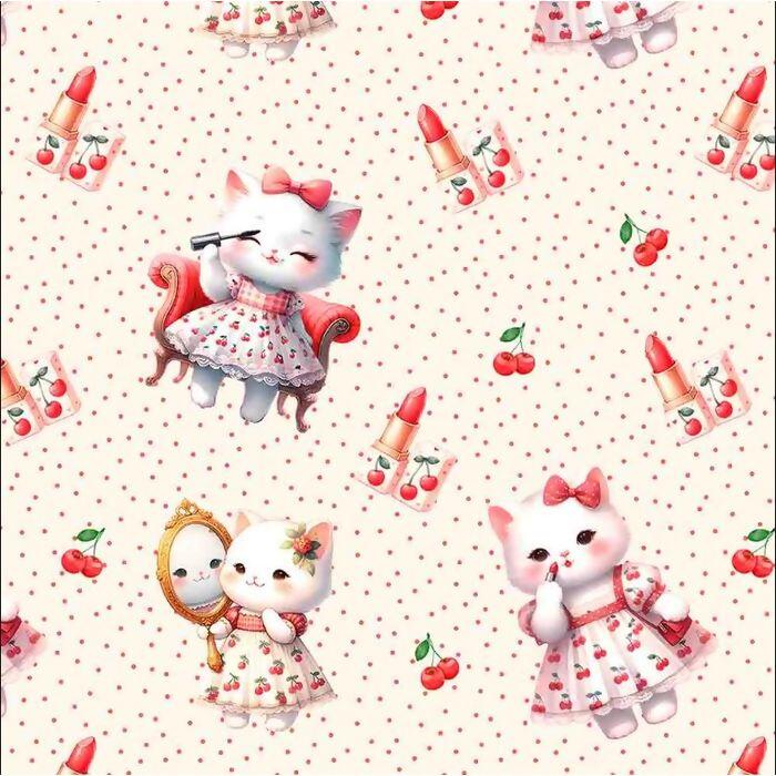 Descrição Tecido Tricoline Digital Cherry Kitties Gatas e Maquiagem