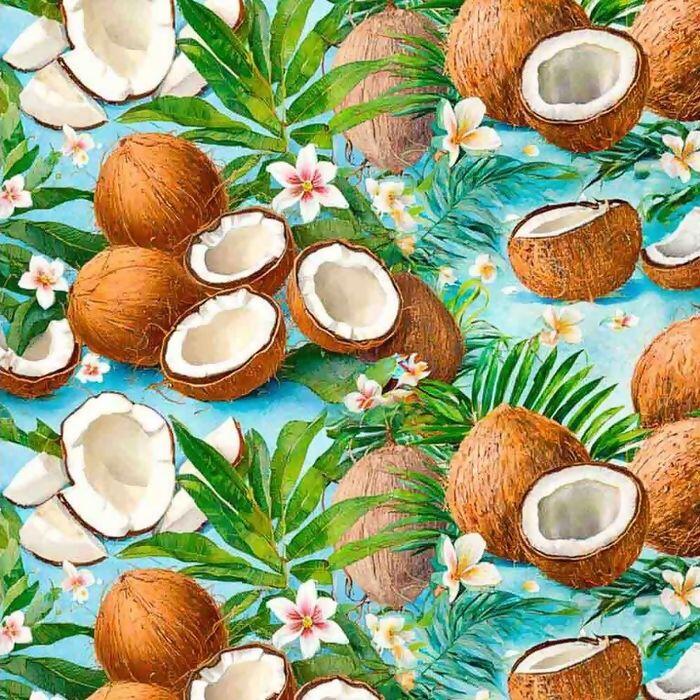 Descrição Tecido Tricoline Digital Cocos Fundo Azul
