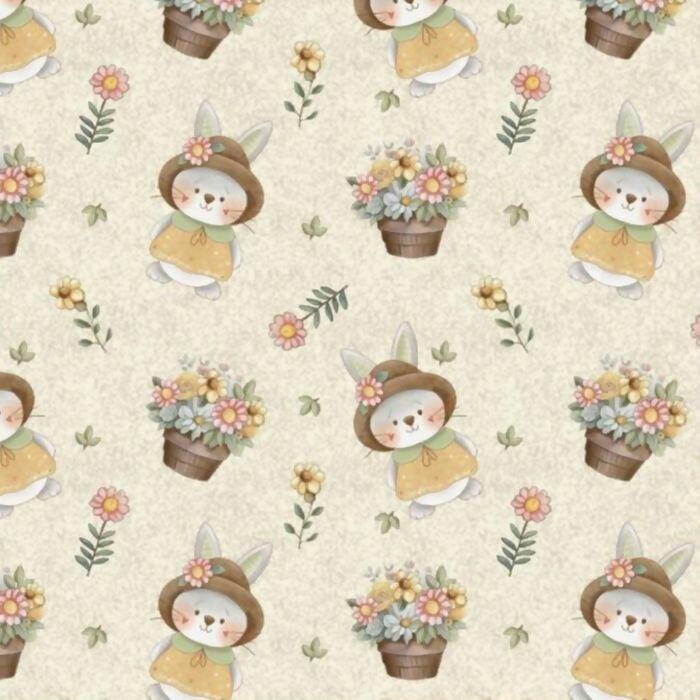 Descrição Tecido Tricoline Digital Coelhinhas e Flores