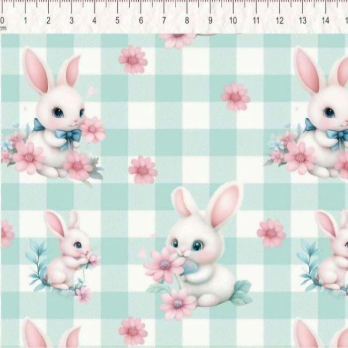 Descrição Tecido Tricoline Digital Coelhos Fundo Xadrez