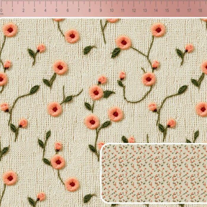 Descrição Tecido Tricoline Digital Coralina Flores Bordadas