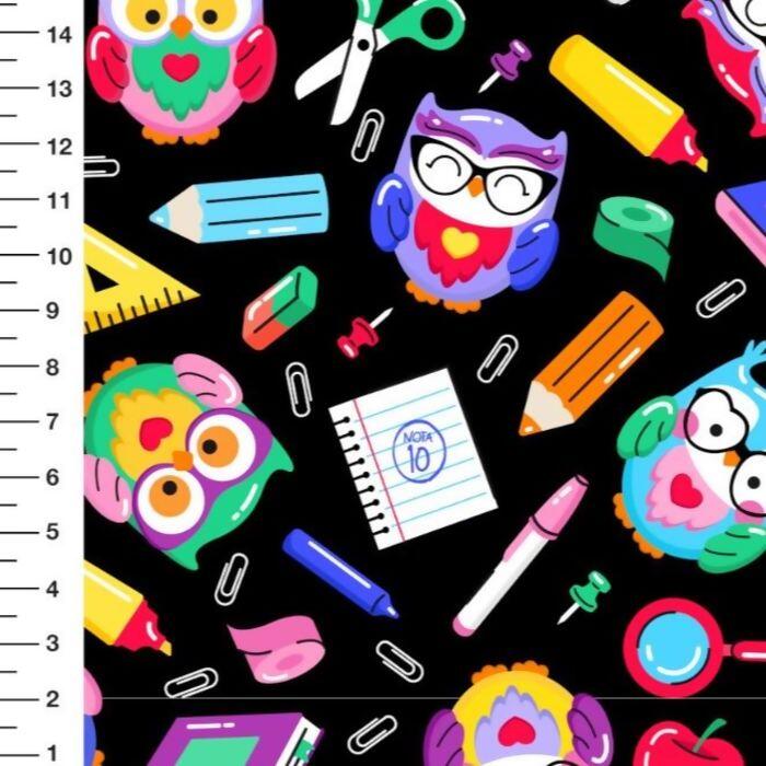 Descrição Tecido Tricoline Digital Coruja Escola Fundo Preto