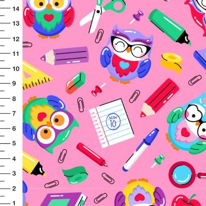 Descrição Tecido Tricoline Digital Coruja Escola Fundo Rosa