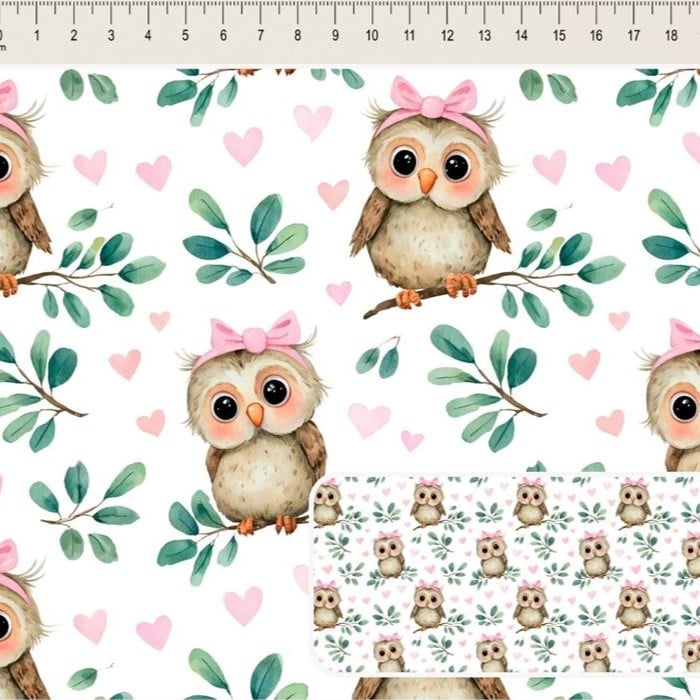 Descrição Tecido Tricoline Digital Corujices Tiara Rosa