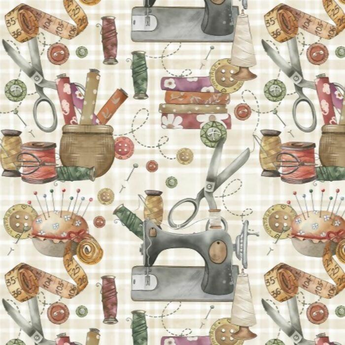 Descrição Tecido Tricoline Digital Costurando Fundo Bege