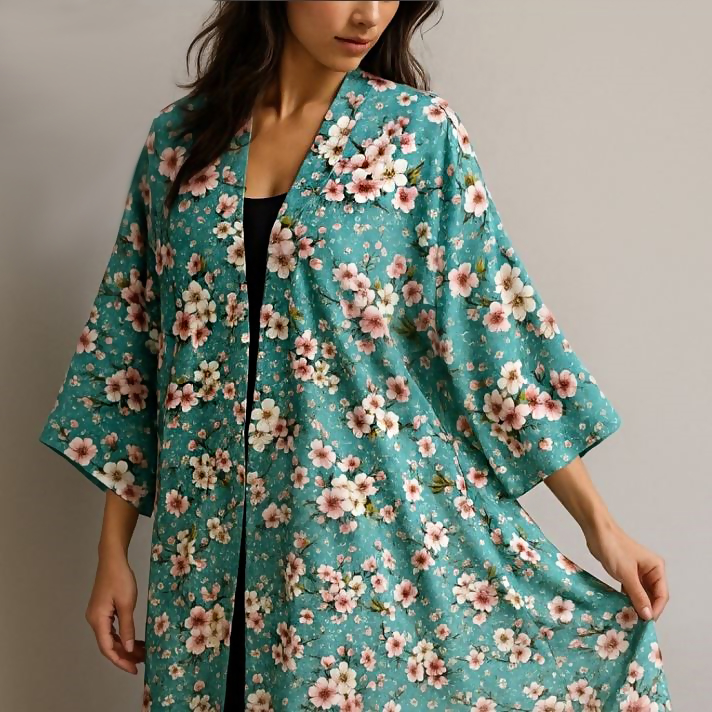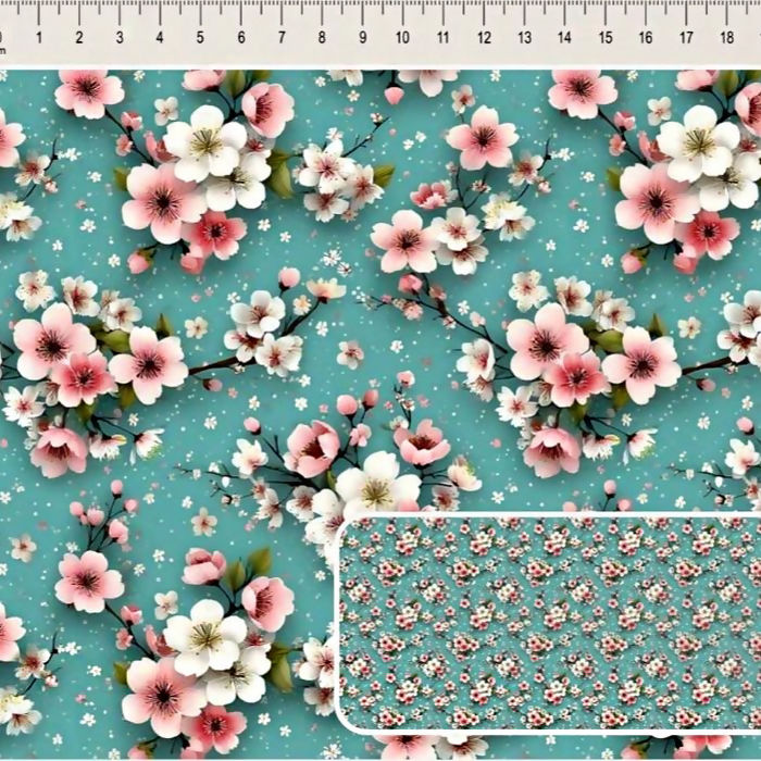 Descrição Tecido Tricoline Digital Cute Kokeshi Flor de Cerejeira