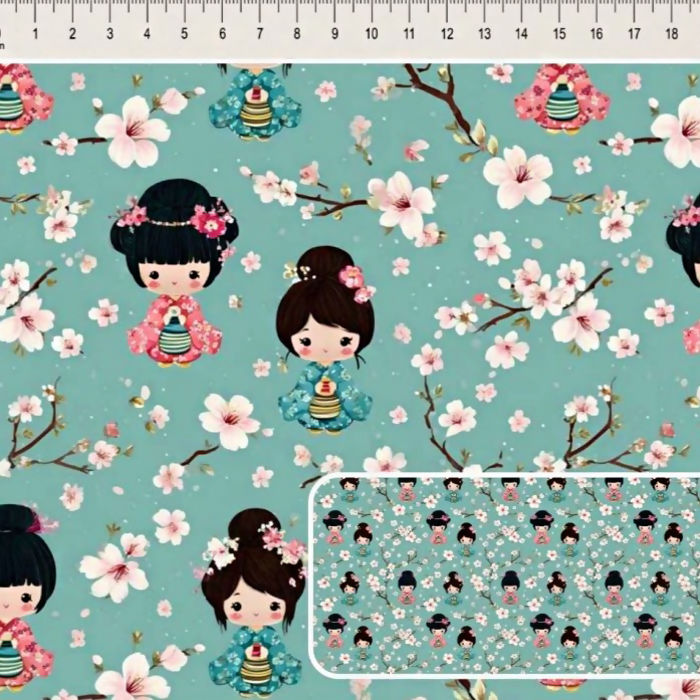 Descrição Tecido Tricoline Digital Cute Kokeshi Japonesas e Cerejeiras