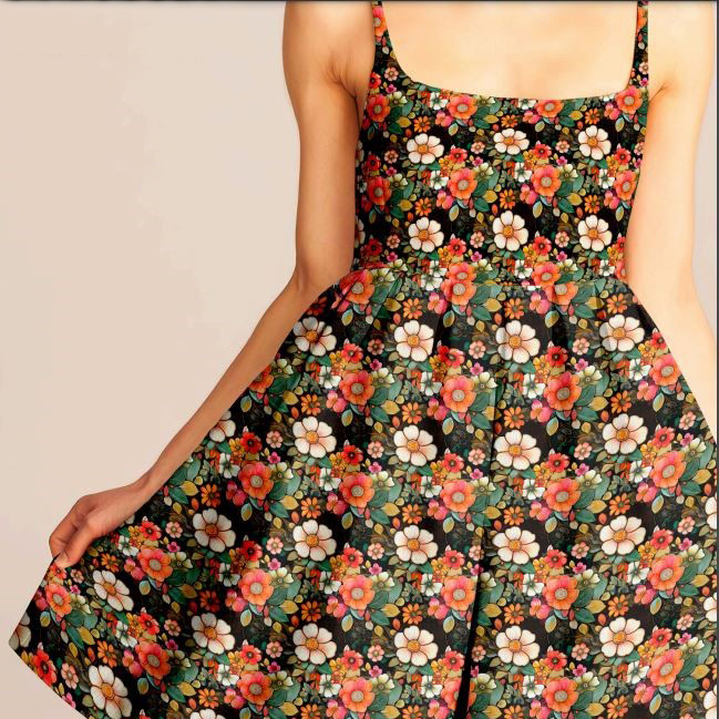 Descrição Tecido Tricoline Digital Exuberance Coral Fundo Preto