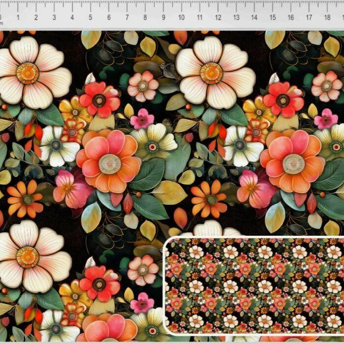 Tecido Tricoline Digital Exuberance Coral Fundo Preto