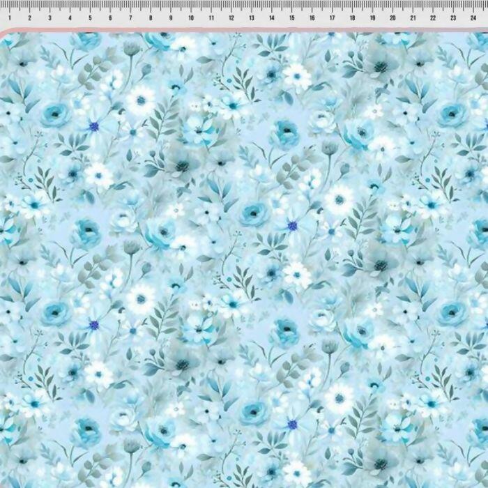 Tecido Tricoline Digital Floral Menor Cheio Azul