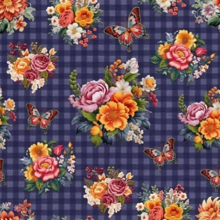 Descrição Tecido Tricoline Digital Flores Fundo Xadrez Azul