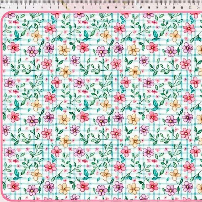 Descrição Tecido Tricoline Digital Flores Fundo Xadrez