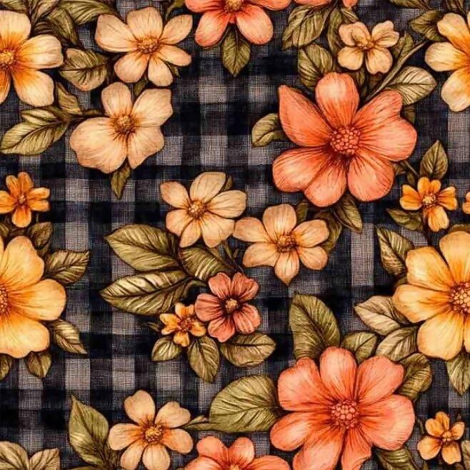 Descrição Tecido Tricoline Digital Flove Flor Xadrez