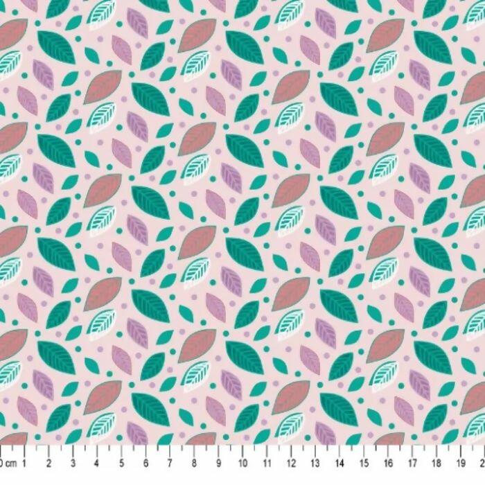 Tecido Tricoline Digital Folhas Coloridas Fundo Rosa