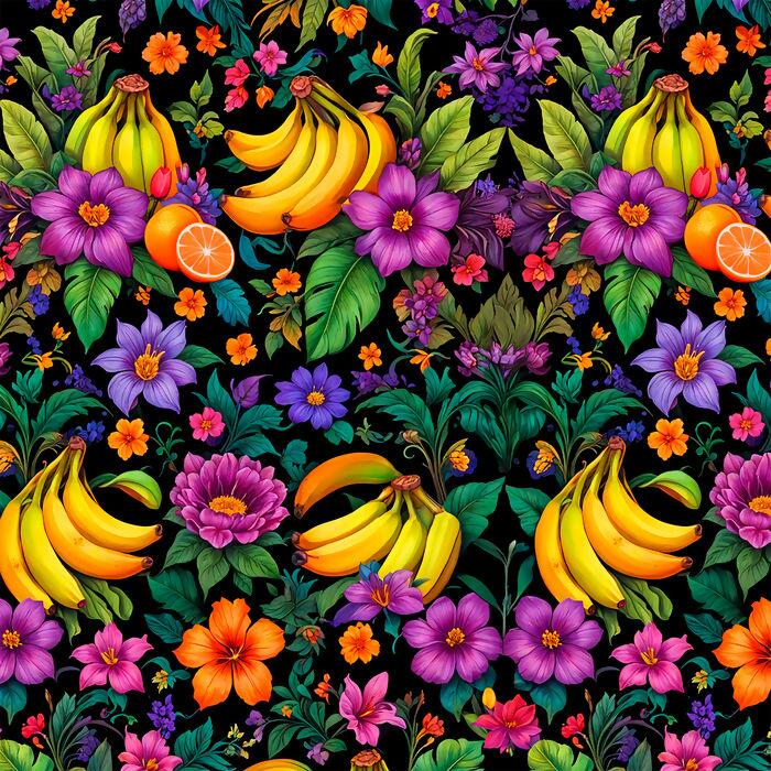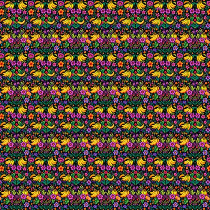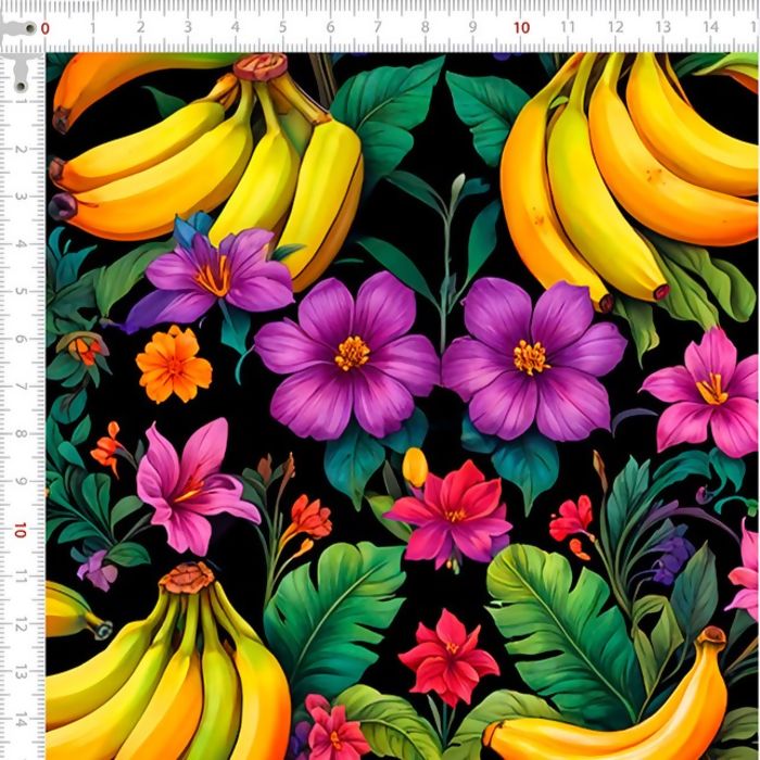 Descrição Tecido Tricoline Digital Frutas e Flores Fundo Preto