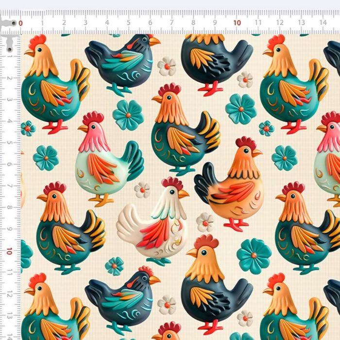 Descrição Tecido Tricoline Digital Galinhas Fundo Creme