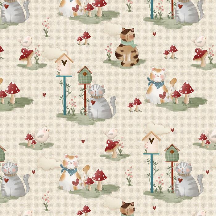 Tecido Tricoline Digital Gatinhos Casinhas Fundo Bege