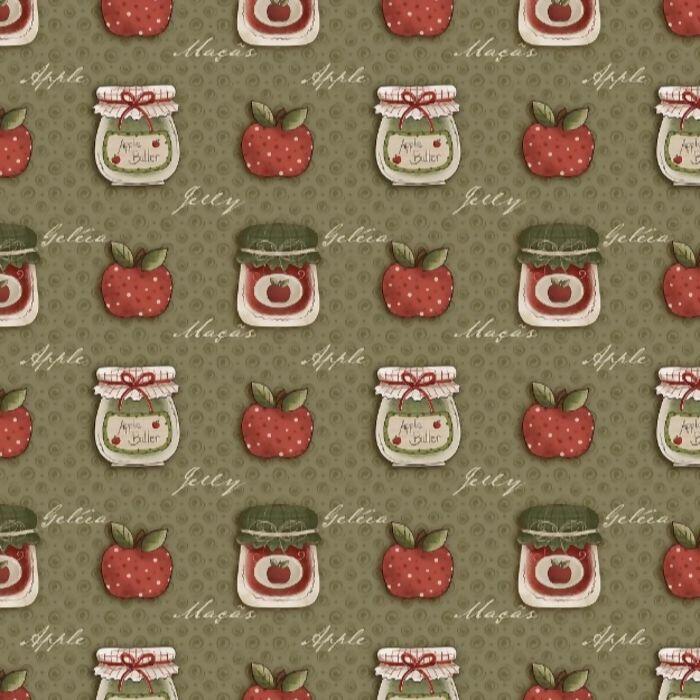 Descrição Tecido Tricoline Digital Geleia Maçãs e Peras Fundo Verde
