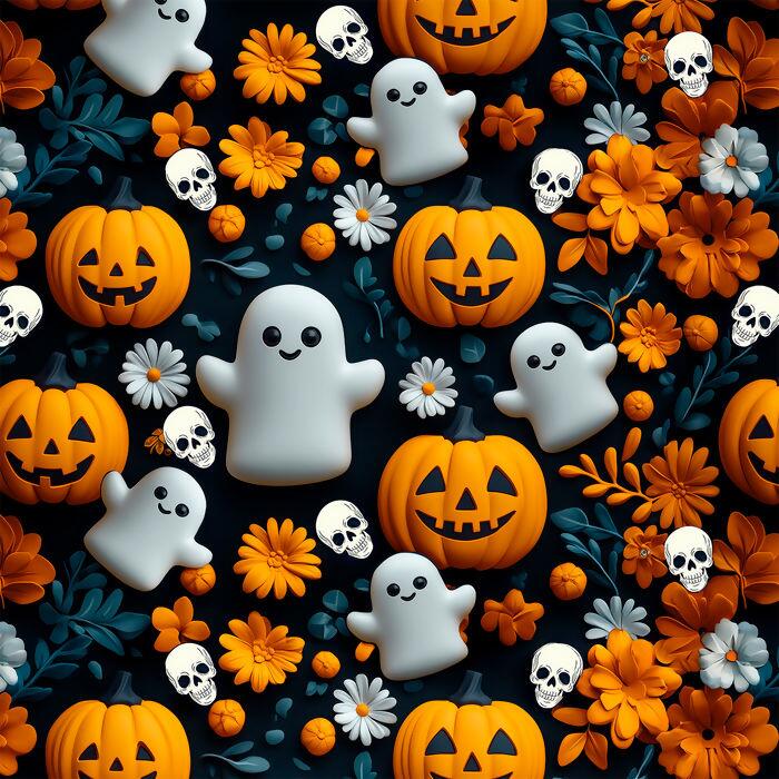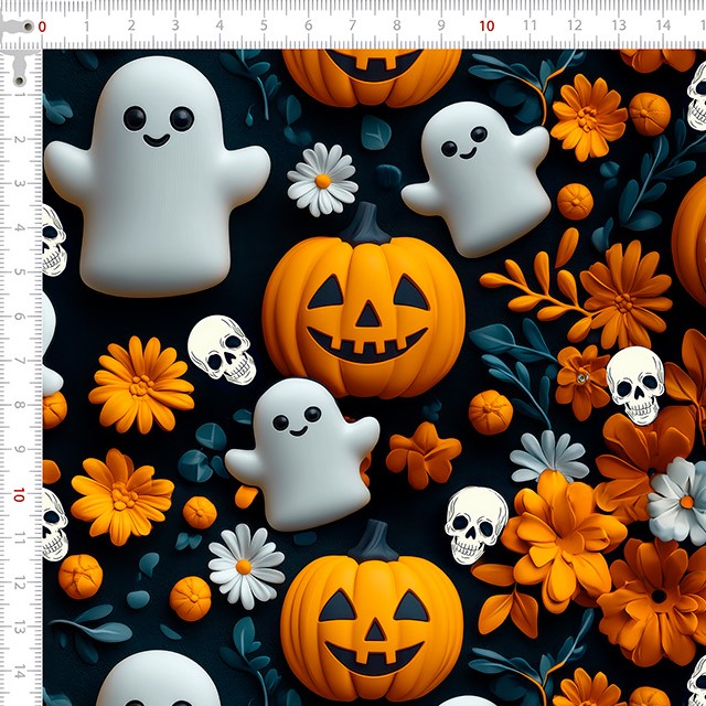 Descrição Tecido Tricoline Digital Halloween Fantasmas e Flores