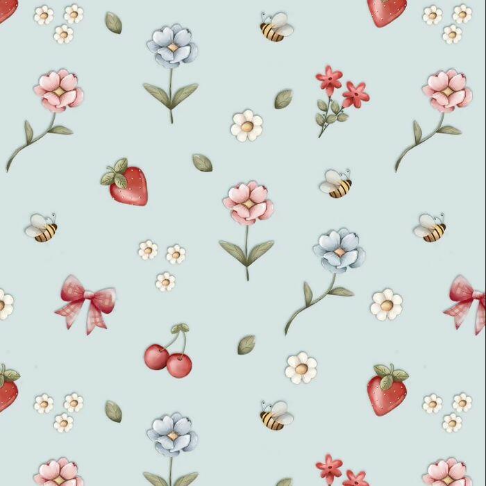 Descrição Tecido Tricoline Digital Jardim Morangos Fundo Azul