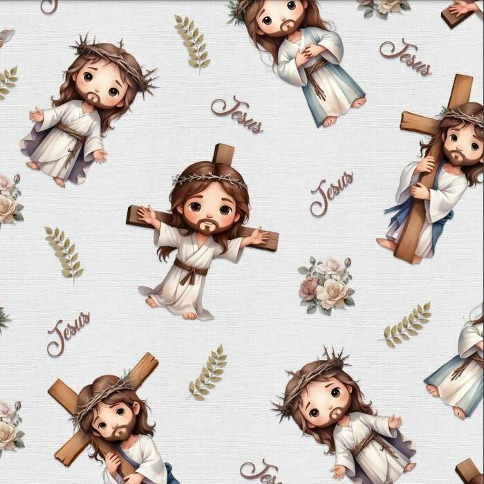Descrição Tecido Tricoline Digital Jesus e Cruz Fundo Cinza