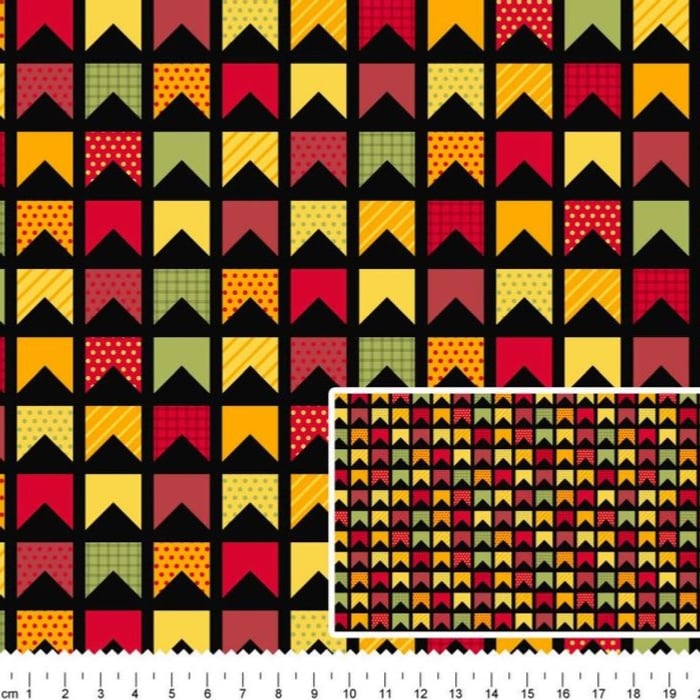 Descrição Tecido Tricoline Digital Junino Bandeirinhas Fundo Preto