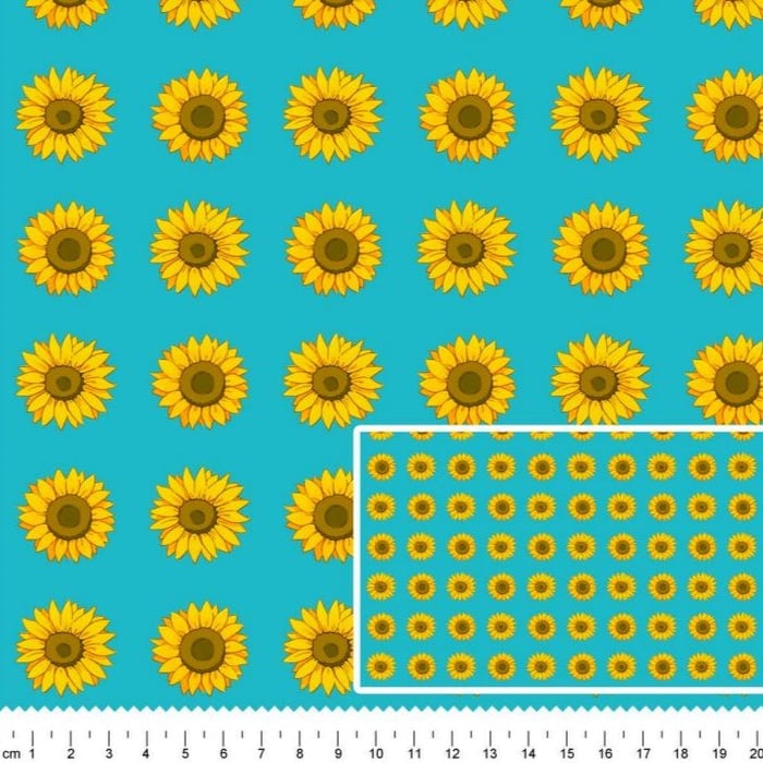 Descrição Tecido Tricoline Digital Junino Girassol Fundo Azul