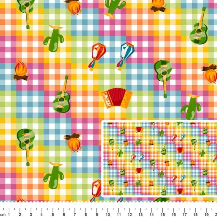 Tecido Tricoline Digital Junino Instrumentos Fundo Colorido