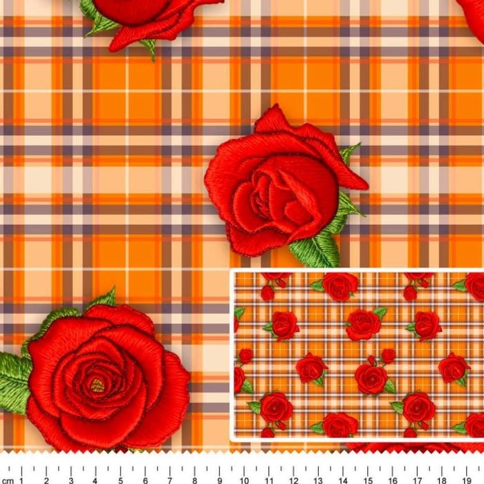 Descrição Tecido Tricoline Digital Junino Rosas Bordadas Fundo Xadrez