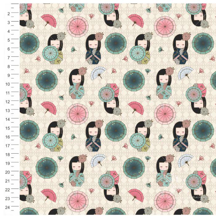 Descrição Tecido Tricoline Digital Kokeshi Bege