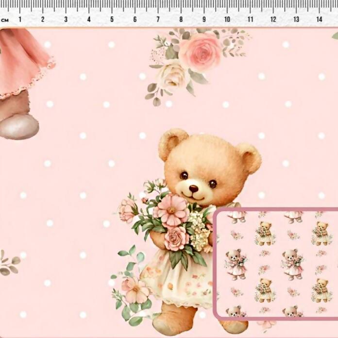 Tecido Tricoline Digital Lady Bear Florzinhas Fundo Rosa
