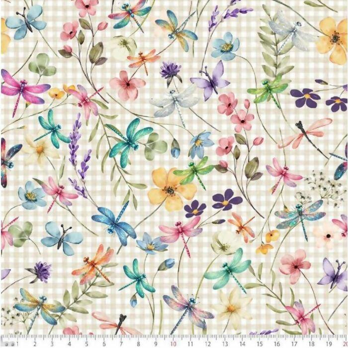 Tecido Tricoline Digital Libélula Fundo Xadrez Bege