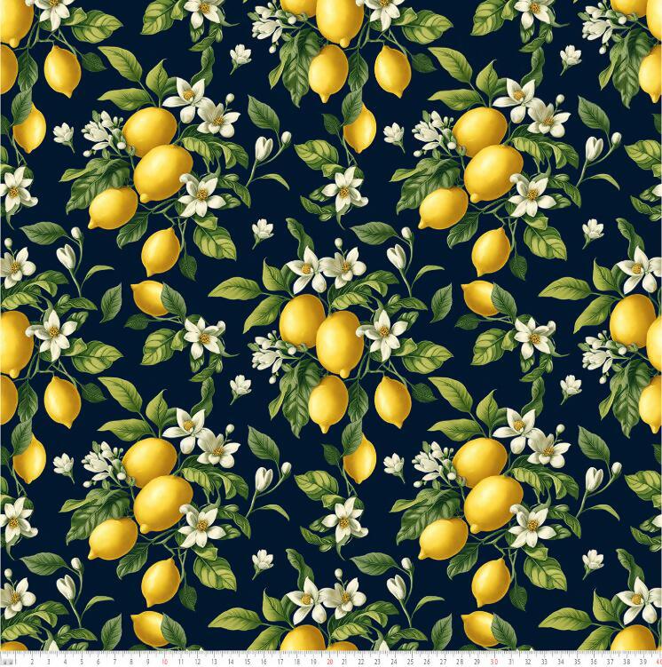 Tecido Tricoline Digital Limão Siciliano Fundo Azul