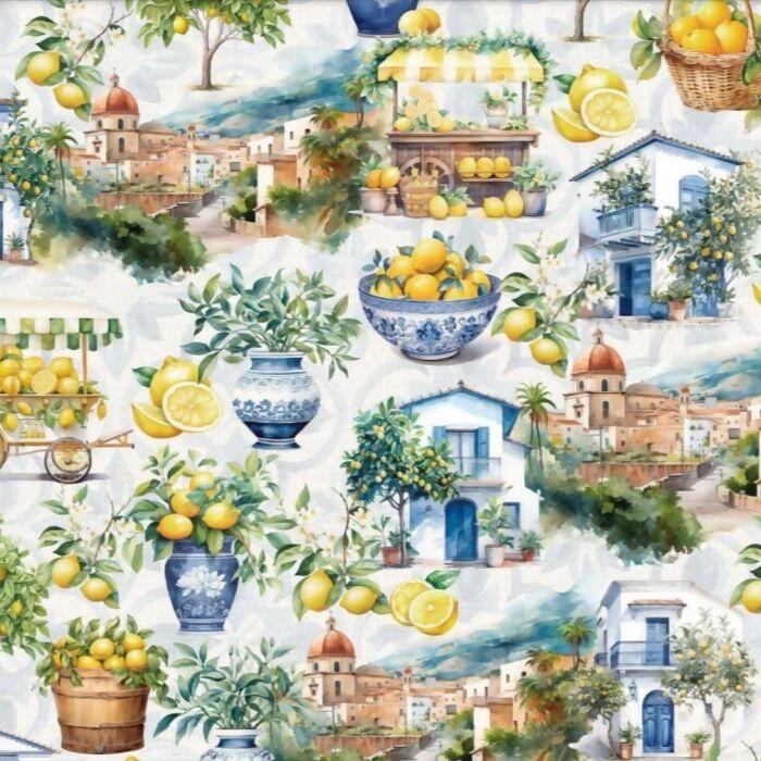 Tecido Tricoline Digital Limões e Cidade