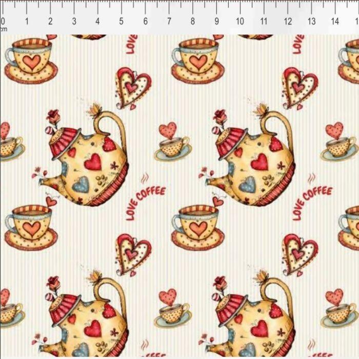 Tecido Tricoline Digital Love Coffee Fundo Listras Creme