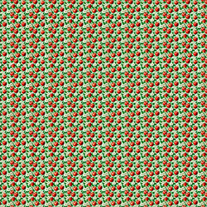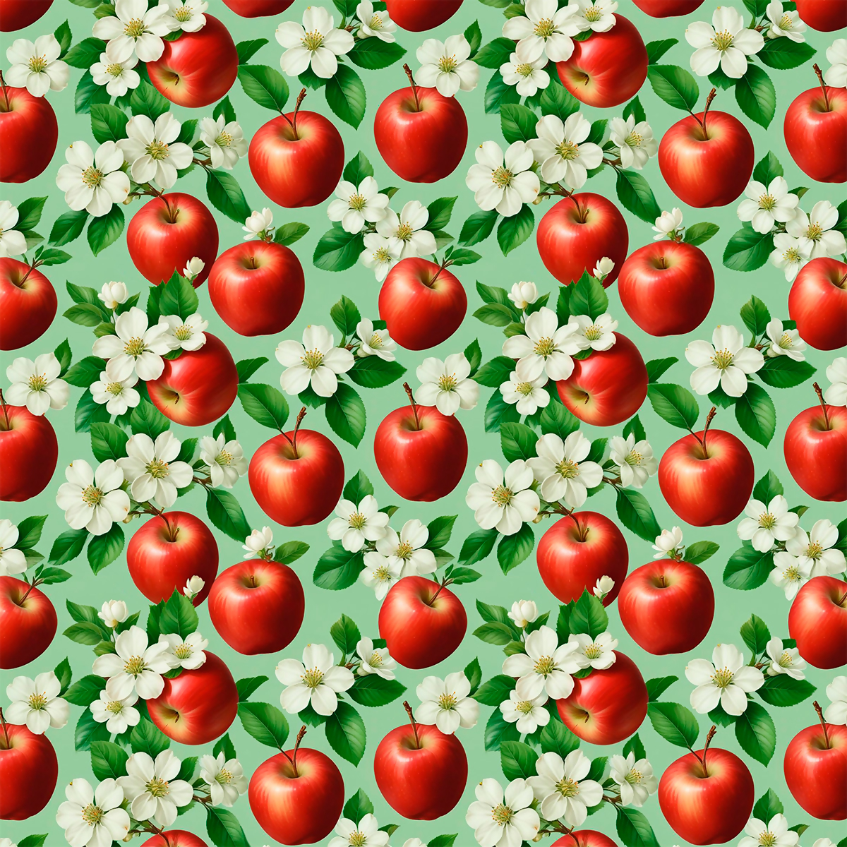 Descrição Tecido Tricoline Digital Maçãs e Flores Fundo Verde Claro