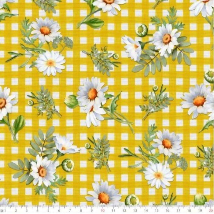 Tecido Tricoline Digital Margaridas Fundo Xadrez Amarelo